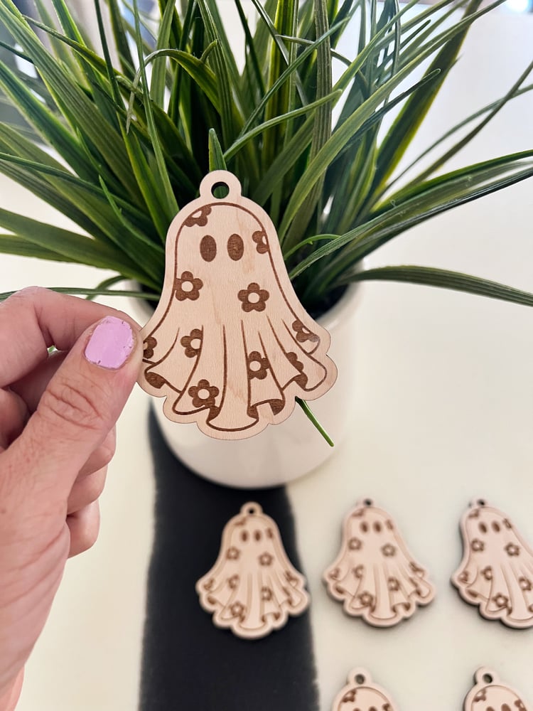 Cutest Floral Ghost Keychain. Comes with a gold chain attached that makes it easy to clip to your keys or bag. Made out of 1/4” wood. Cutest flowers etched into the wood. Boho Halloween perfection. 3-5 day turnaround. If you’re local and want to pickup in South Gilbert, use code LOCALSATURDAY at checkout. You will get an email once your item ships or is ready for pickup.